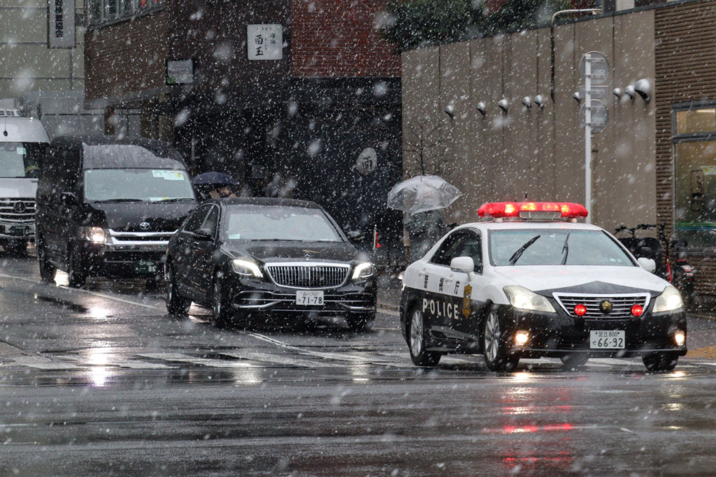 この車列写真では、要人警護らしい先導車(パトカー)と黒塗り車列が雨天の都心部を走行しており、周辺には案内標識が複数見えます。